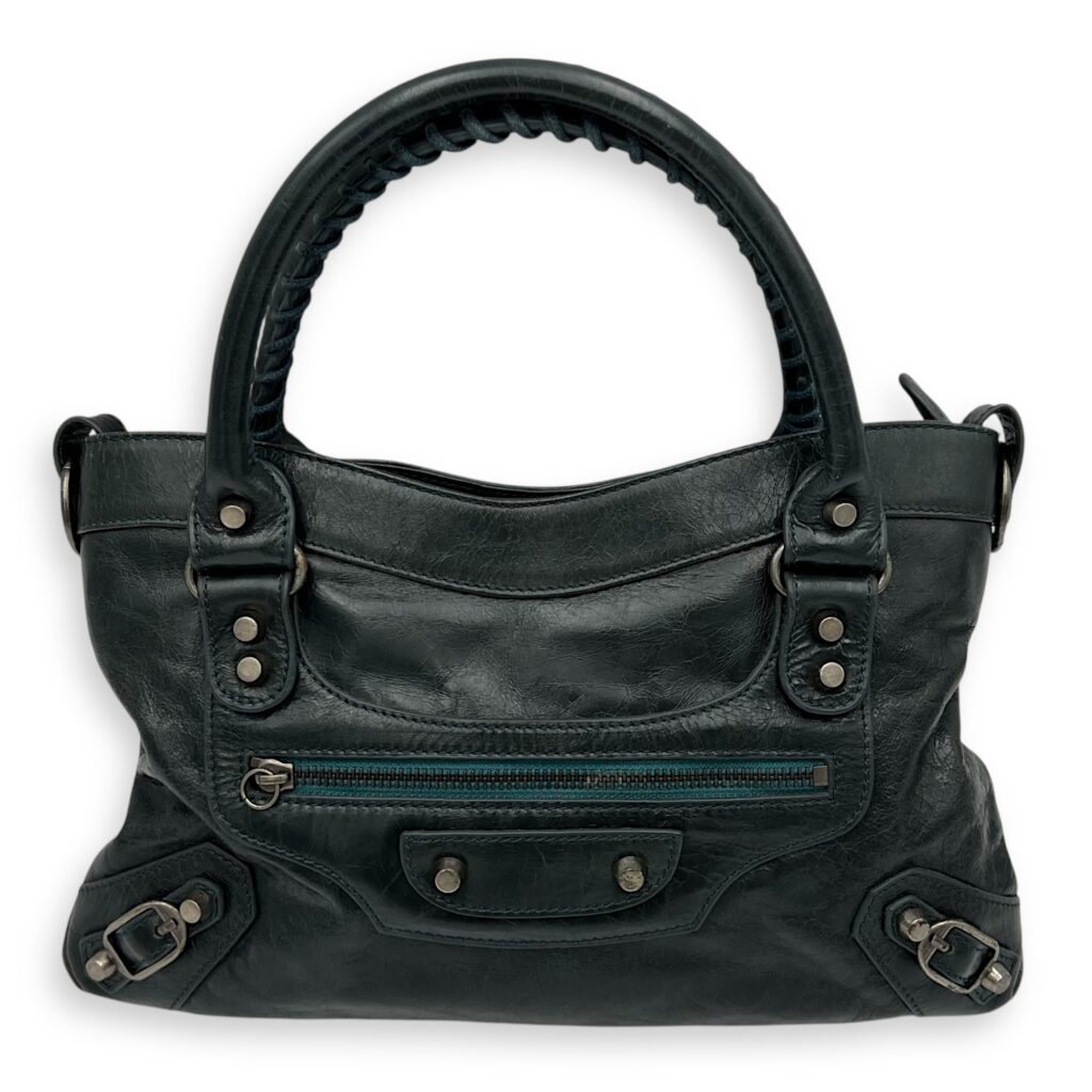 First Green Top Handle Bag in Calfskin, Silver hardware