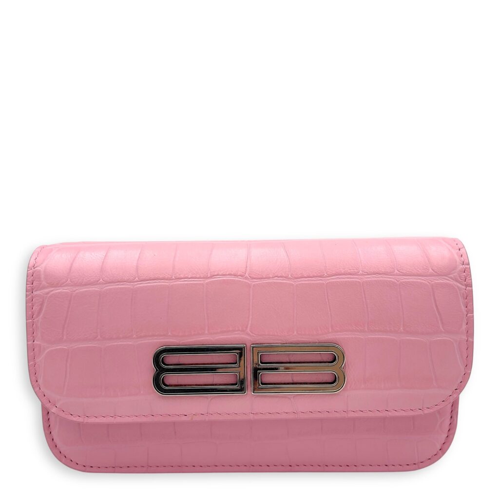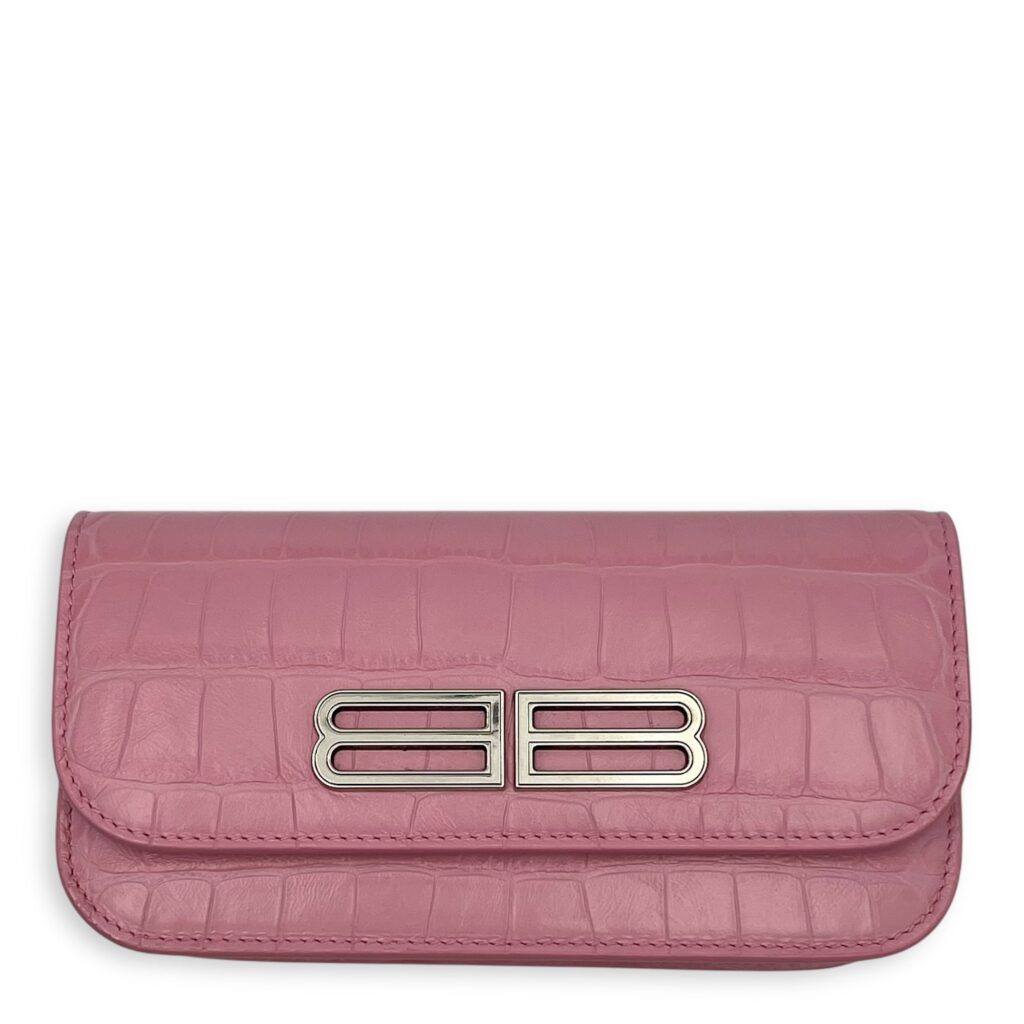 Gossip Pink Wallet On Chain in Crocodile Embossed Calfskin, Silver hardware