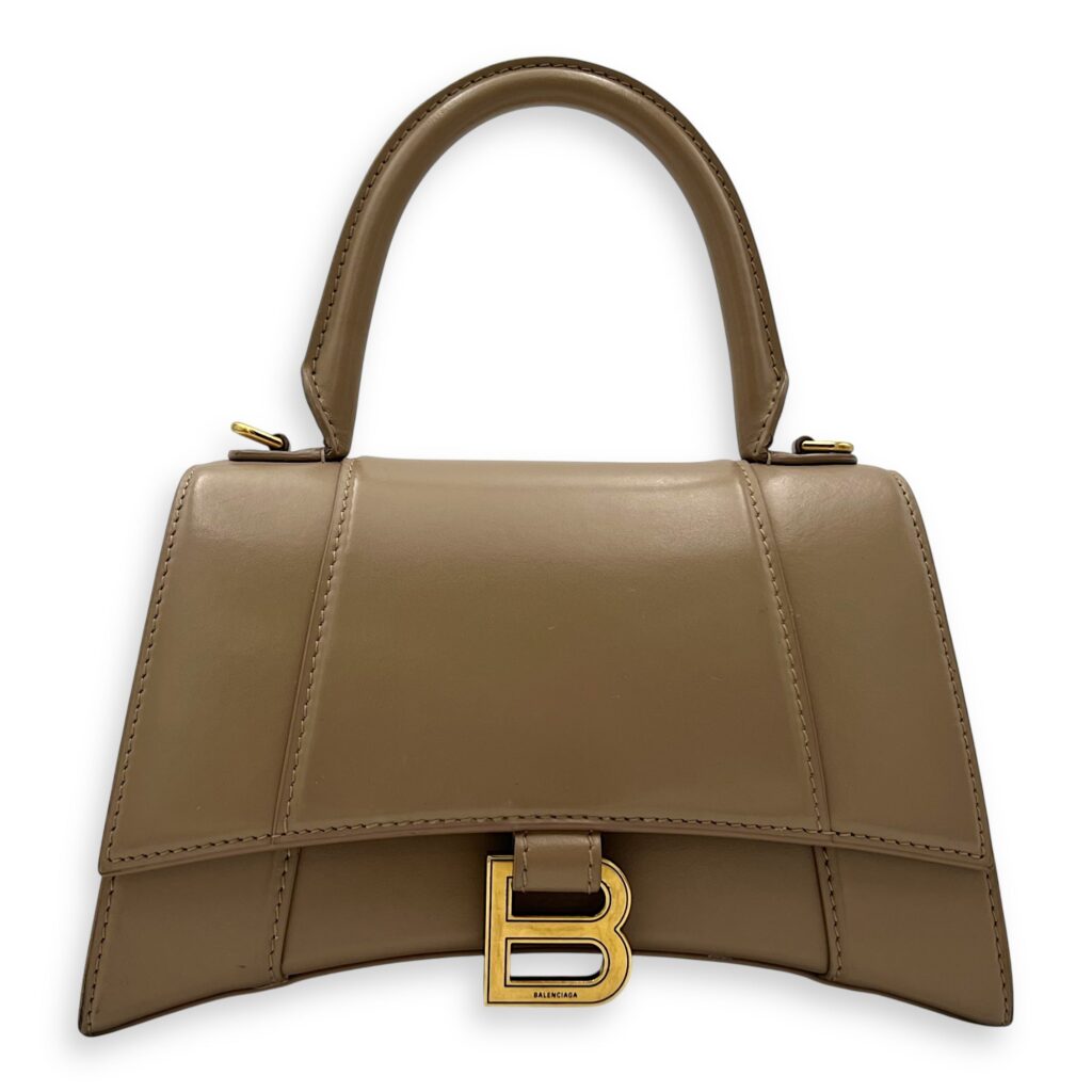 Hourglass Small Beige Top Handle Bag in Calfskin, Gold hardware