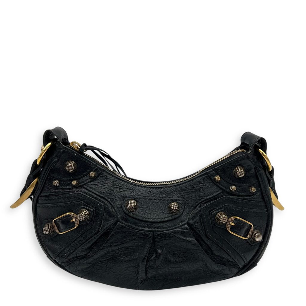 Le Cagole XS Black Shoulder Bag in Distressed Leather, Gold hardware
